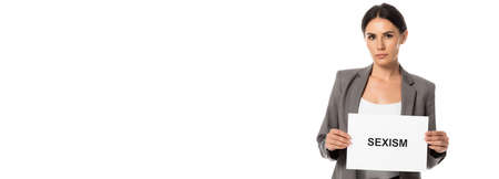 panoramic crop of attractive businesswoman holding placard with sexism lettering isolated on white