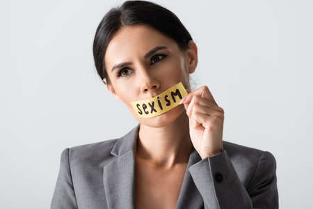 businesswoman touching duct tape with sexism lettering on mouth isolated on white