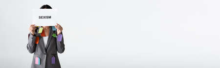 panoramic crop of businesswoman with labels on suit holding placard with sexism lettering isolated on white