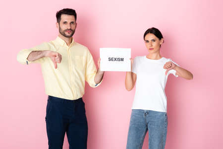 man and woman in white t-shirt holding placard with sexism lettering and showing thumbs down on pink