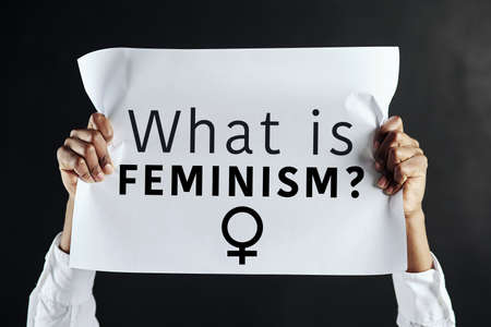 The question on everybodys lips. Studio shot of an unrecognisable woman holding up a sign with the words What is feminism on it.
