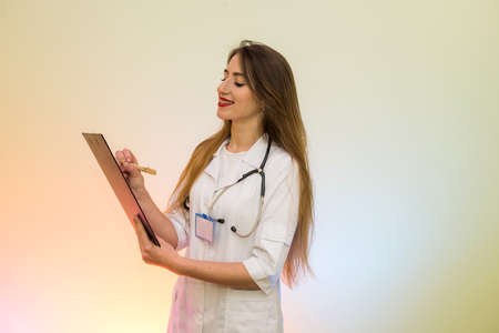 A female doctor in a medical gown looks at the camera and records in clipboard. White background. Doctors advice.