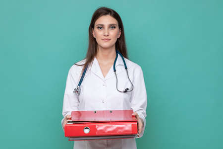 Young beautiful female doctor in white surgical coat with black stethoscope and blue paper holder in hands standing at medical office