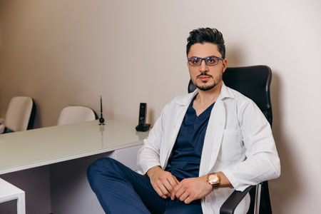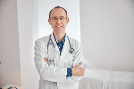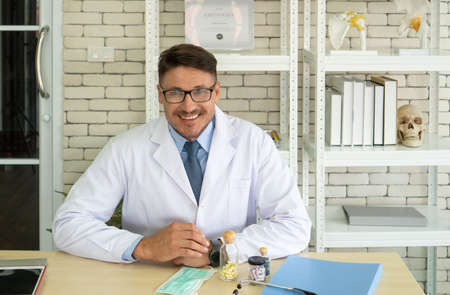 Portrait Caucasian man doctor sit with arms crossed smile confident friendly at desk in clinic. Surgeon Orthopedist Medical Consultation at hospital - Concept.