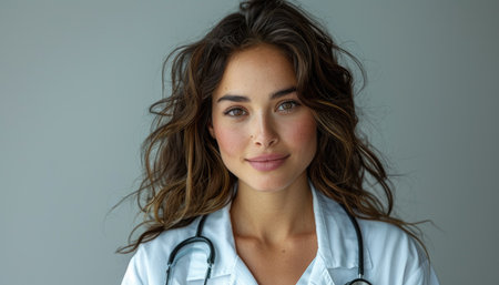 Waist-length portrait of a woman doctor in a white coat with a stethoscope around her neck on solid background, copy space