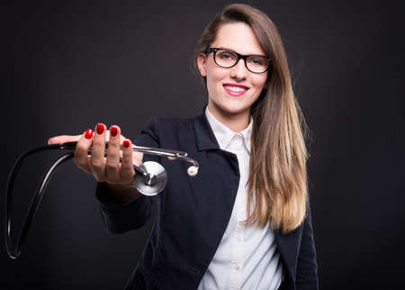 Physician or doctor holding stethoscope. Listening story patient concept. Isolated on black background