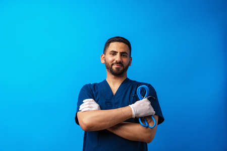 Handsome young male doctor in blue uniform with stethoscope against blue background
