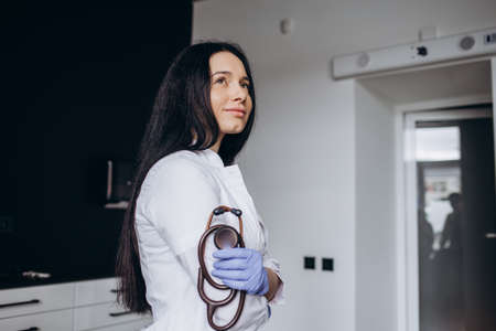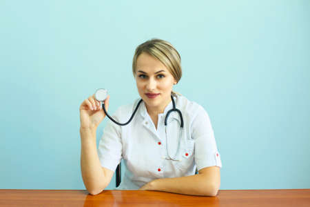 Portrait of a female doctor with makeup in a white coat with a phonendoscope in her hand