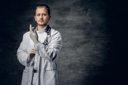 Man doctor with blond hair wearing protective eyeglasses against gray background