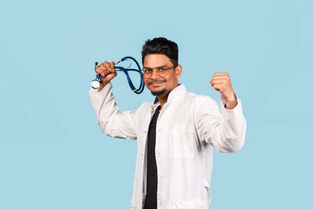 handsome young Indian / Asian doctor with stethoscope in white coat triumphantly raised his hand up against blue background.