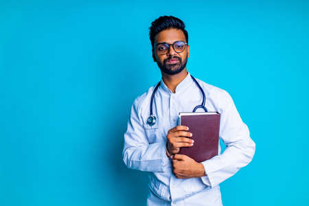 Medical concept of Indian beautiful female doctor in white coat with stethoscope, waist up. Medical student. Woman hospital worker looking at camera and smiling, studio, blue background