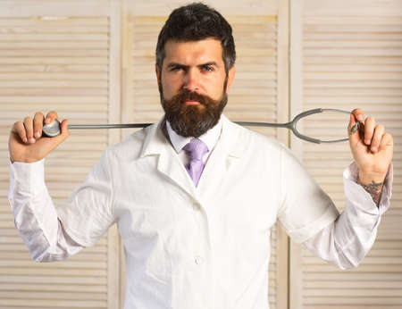 Serious doctor with stethoscope in clinic in surgical uniform. Physician with serious face ready to diagnose. Handsome bearded doctor in white coat. Healthcare and treatment concept.