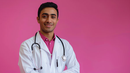 A confident young male doctor wearing a white lab coat and stethoscope smiles warmly against a bright pink backdrop, symbolizing healthcare and professionalism.