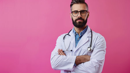 A professional male doctor with glasses and beard, wearing a white coat and stethoscope, looking confidently at the camera on a pink backdrop.