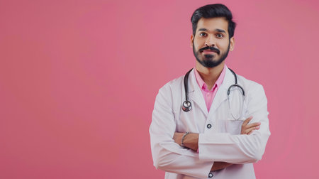A professional Indian doctor with a beard, wearing a white coat and stethoscope, confidently stands with arms crossed against a vibrant pink backdrop.