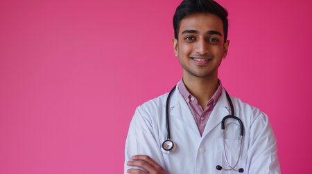 A smiling young Indian doctor in a white coat with a stethoscope, standing against a vibrant pink background. Professional medical portrait.