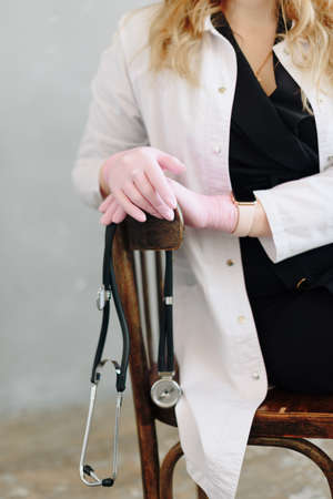 Beautiful young happy doctor woman in medical gloves and glasses with a stethoscope in the hospital shows hand gestures. selective focus. portrait. close-up