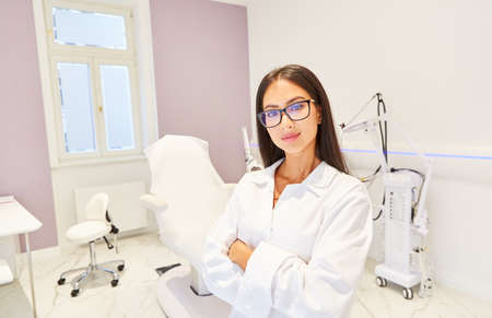 Confident portrait of beautiful serene woman doctor in white medical gown, looking at camera posing with crossed arms against blue colored background with copy space for medical advertising
