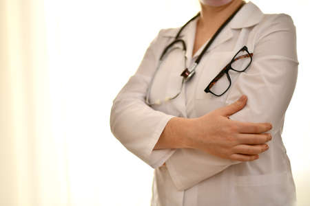 Cropped image of a female doctor in a white gown standing in her office with her arms crossed and holding a stethoscope.