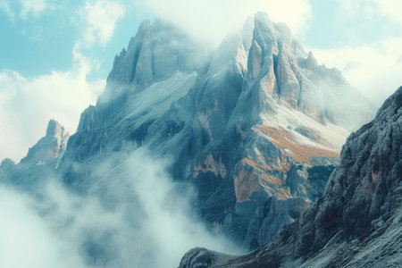 Epic close-up view of some mountain peaks somewhere in Dolomites, Italy. Arounded by clouds. High view
