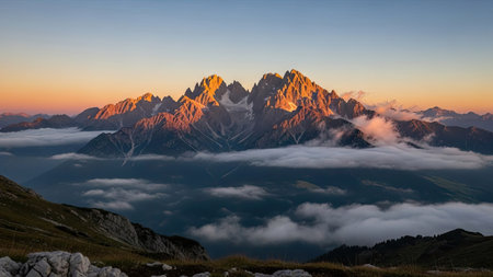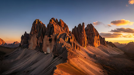 Panoramic view of Dolomites mountains at sunrise, Italy