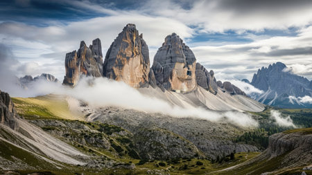 A beautiful shot of Three Peaks Nature Park partially covered in clouds in Toblach, Italy