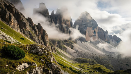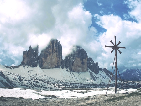 Tre Cime di Lavaredo rocks hidden in gentle fog. Early summer trip in Dolomites in Italy.