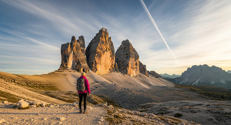 A hiker explores the stunning tre cime di lavaredo in the dolomites italy under a beautiful sky, capturing the essence of adventure travel