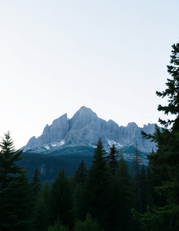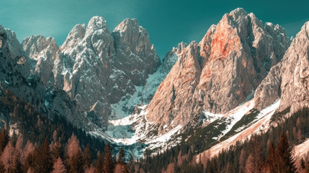 Stunning view of rocky mountains at sunrise showcasing peaks with snowcap and surrounding lush forest under a clear turquoise sky, perfect for a natural escape.