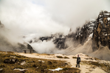 young man enjoying the view of the mountains landscape in the dolomites mountain range. tre cime di lavaredo national park, south tyrol