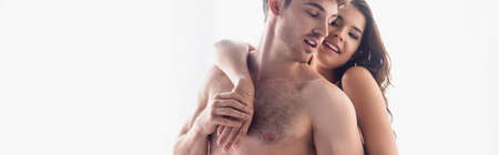 panoramic concept of brunette woman hugging shirtless boyfriend isolated on white