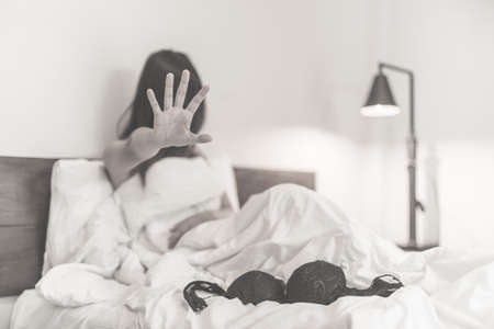 Girl hand is stopping harassment on the bedroom. stop violence against Women, international women's day.