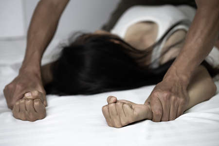 Close up of man hands holding a woman hands for rape and sexual abuse concept, Wound domestic violence rape, sexual assault, stop violence against women, human trafficking.