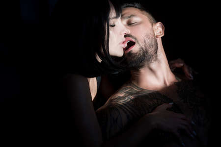 side view of sexy woman kissing bearded boyfriend on leather couch with lighting isolated on black, banner