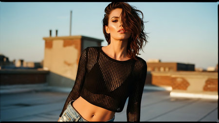 A woman stands confidently, posing in a trendy outfit against an urban setting. The bright sunlight highlights her features as she gazes into the distance, showcasing a bold look.