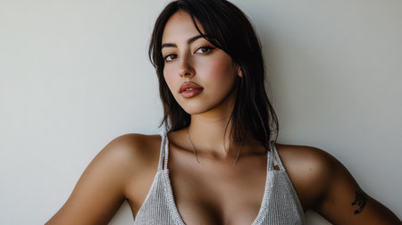 A young woman with long brown hair stands against a neutral wall, dressed in a light top. She exudes confidence with a calm expression and slightly parted lips, highlighting her features.