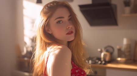 A young woman with long, wavy red hair and green eyes looks over her shoulder at the camera. She is wearing a red floral top and is in a kitchen setting, with soft, warm light illuminating her face and hair.