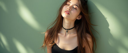 A beautiful young woman with long, flowing hair leans against a soft green wall, eyes closed in a moment of tranquility. The gentle sunlight casts delicate shadows, enhancing her peaceful expression and the elegance of her choker necklace.