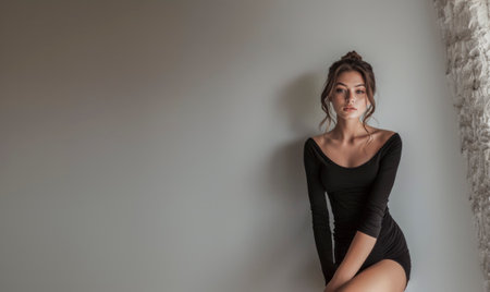 Elegant young woman in a black dress sitting against a minimalist wall with soft lighting. Sophisticated and poised expression in a serene setting