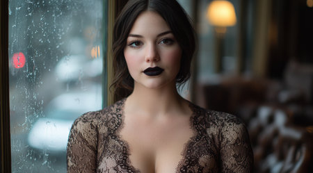 Mysterious woman in lace dress gazing through rainy window