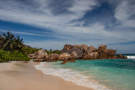 Grand Anse exotic pristine beach at La Digue island in Seychelles. White sandy beach with blue ocean lagoon, rolling waves, white clouds, granite rocks in background.