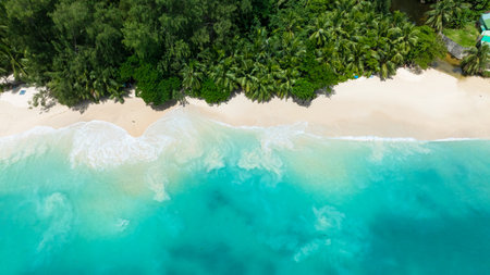 Aerial view of beautiful beach with white sand, turquoise water and coconut palm tree at Seychelles