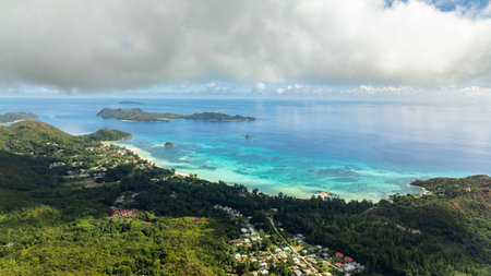 Panoramic aerial view of Seychelles Island on a sunny day from drone