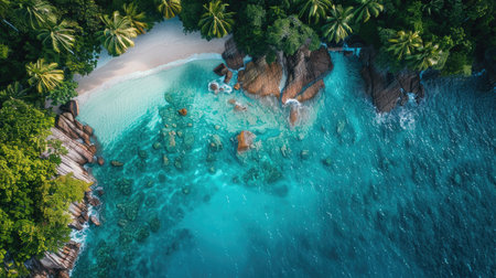 Generative AI : Aerial view of La Digue Island coastline with palm trees Seychelles