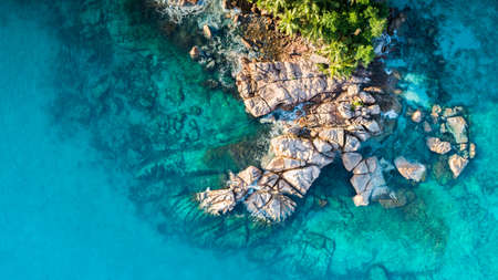 Aerial top view of granite rock formation surrounded by blue ocean lagoon. La Digue, Seychelles