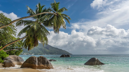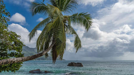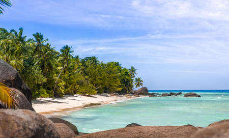 Beautiful beach in Seychelles with rocks and palm trees, blue Indian Ocean and picturesque sky.
