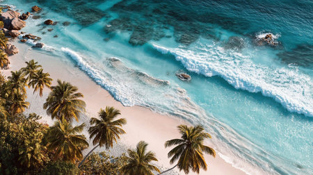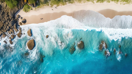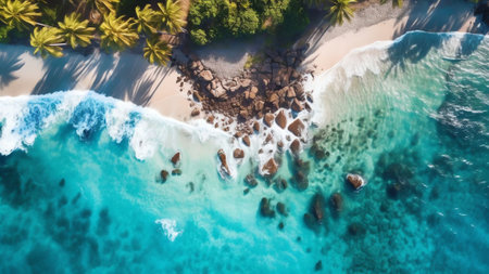 Generative AI : Aerial view of waves breaking on the beach Seychelles
