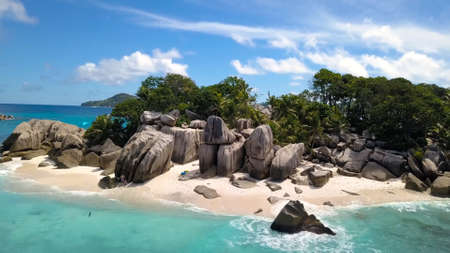 Aerial drone helicopter view of crystal clear turquoise water and amazing granite rocks. La Digue Island Seychelles