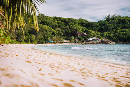 Tropical scene of beautiful white sand beach, turquoise ocean lagoon and foliage. Vacation in paradise. Mahe Island, Seychelles