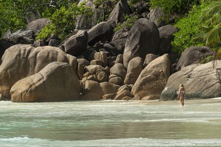La Digue, Seychelles. Granite boulder rocks on day hike around island.